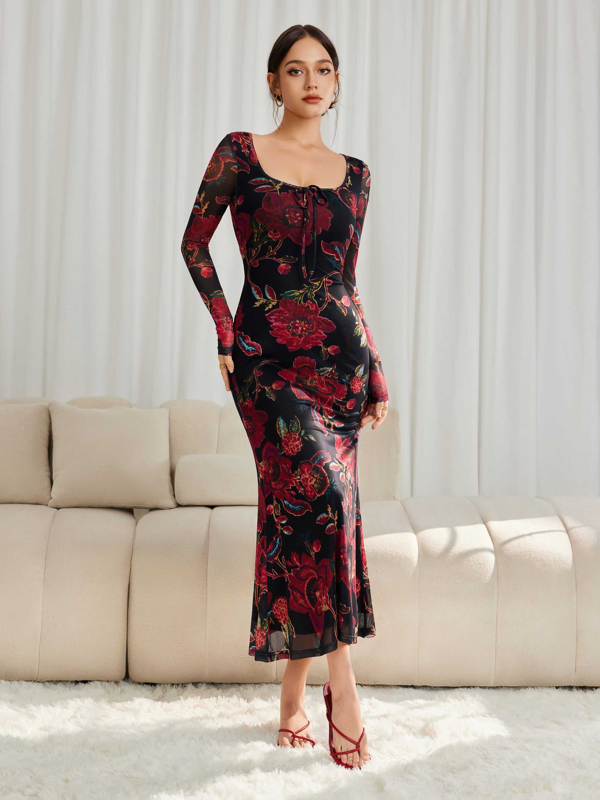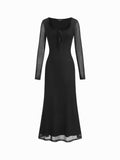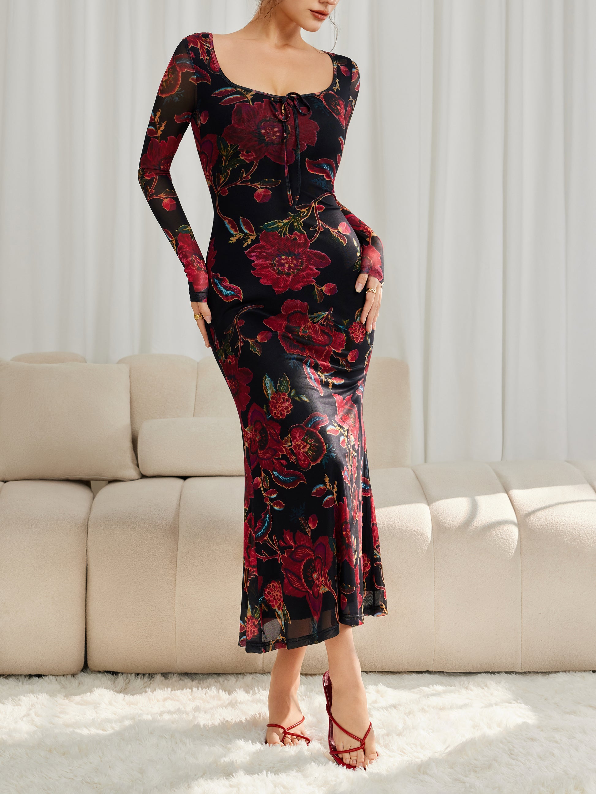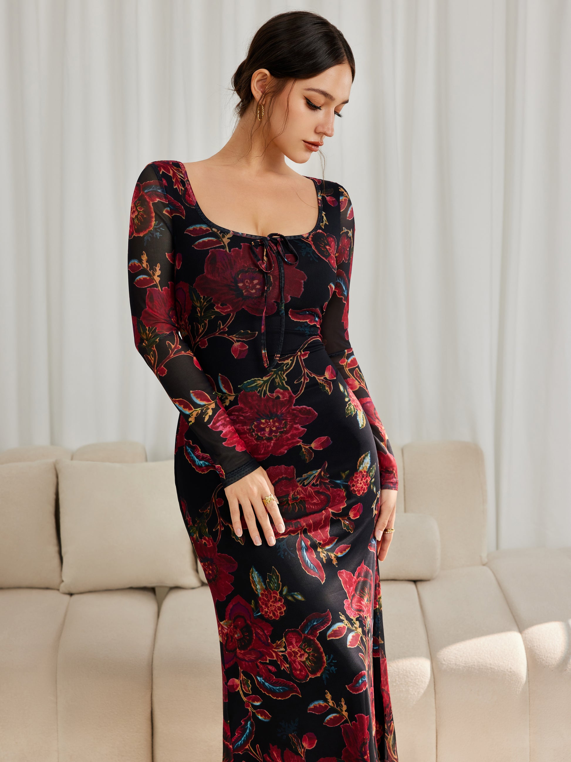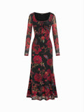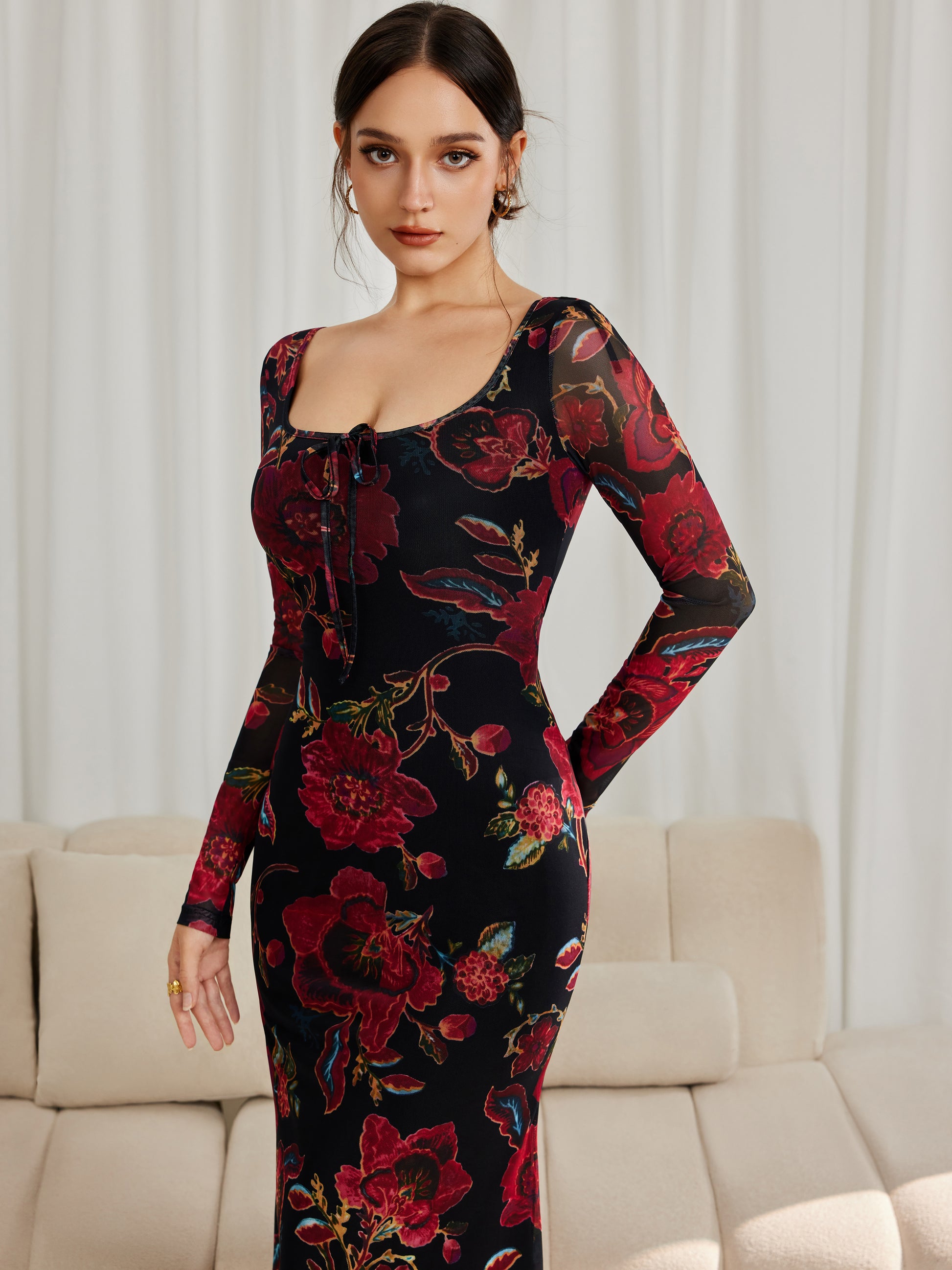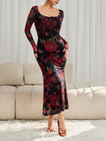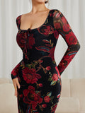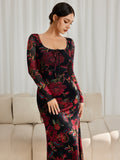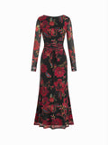 Floral Mesh Long Sleeve Maxi Square Neck Dress
