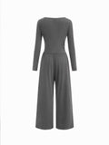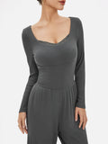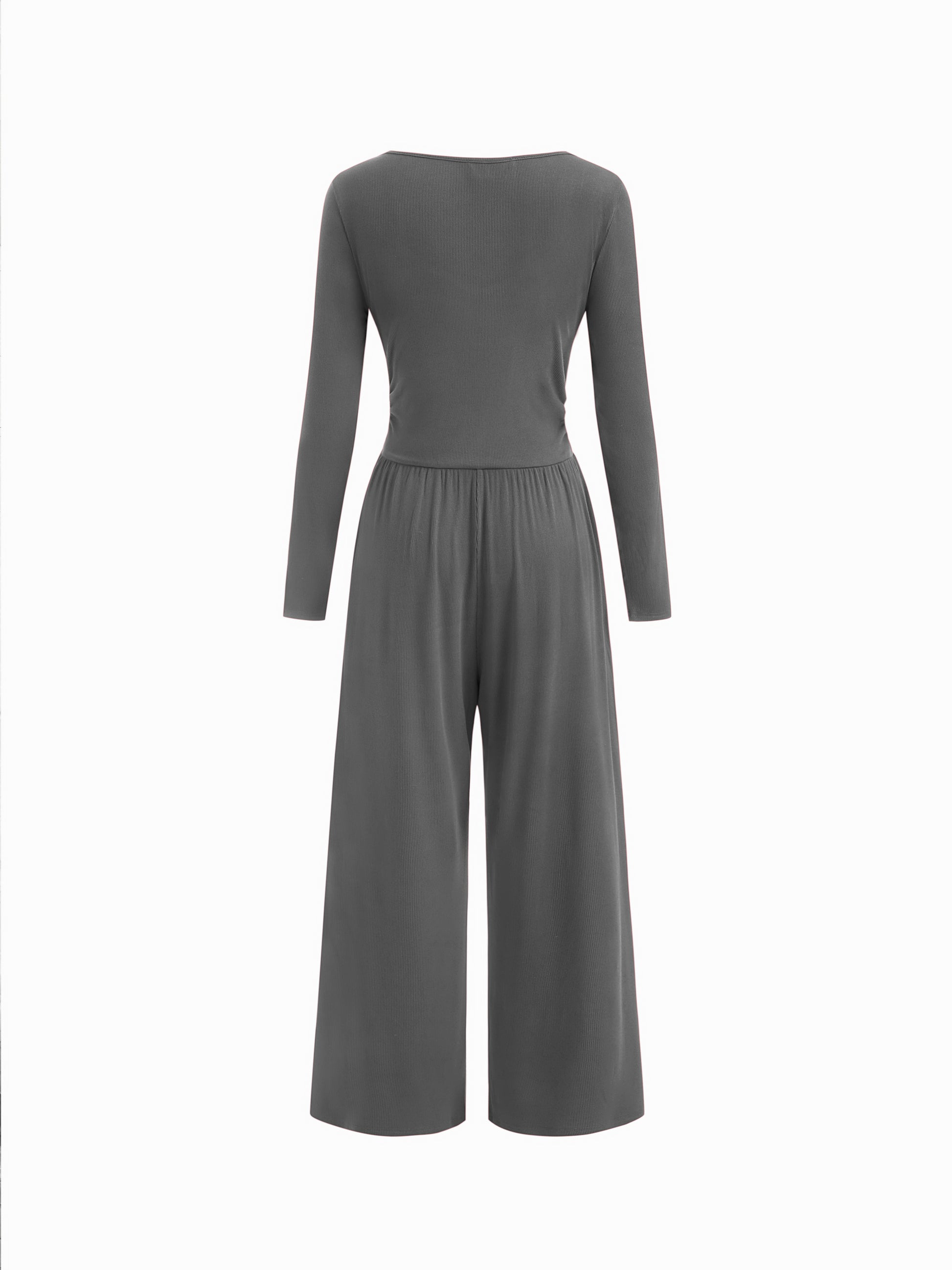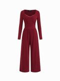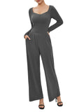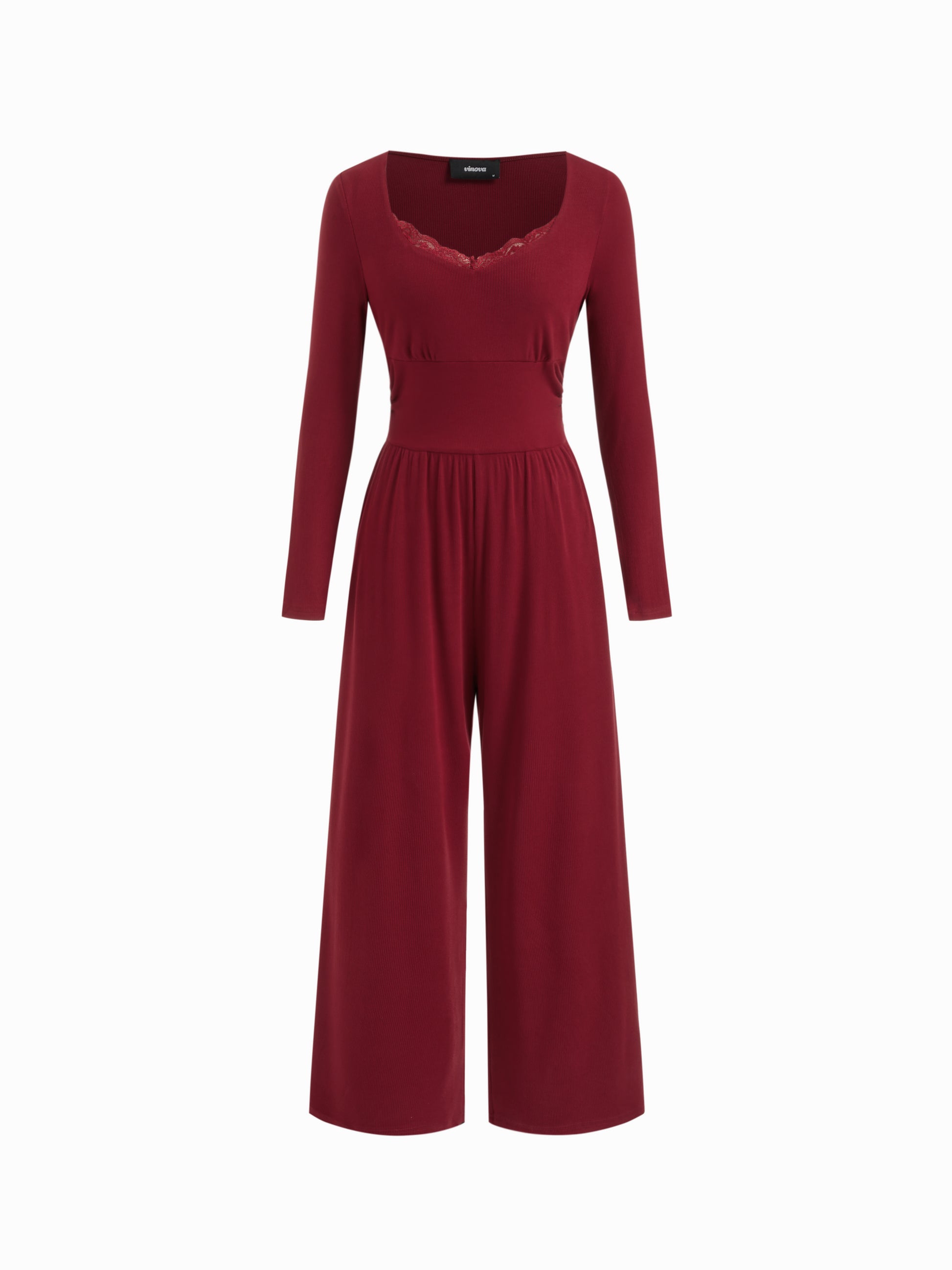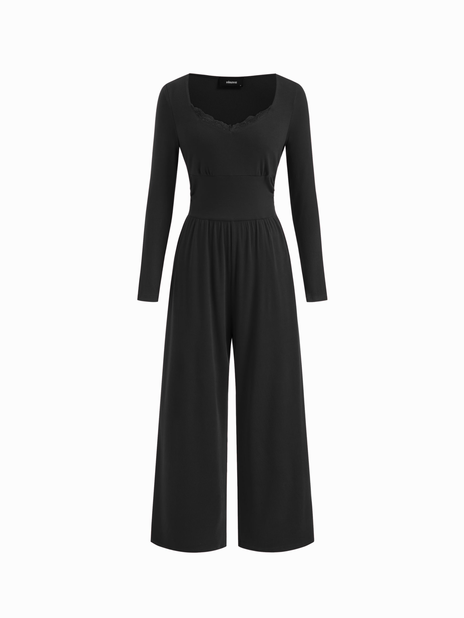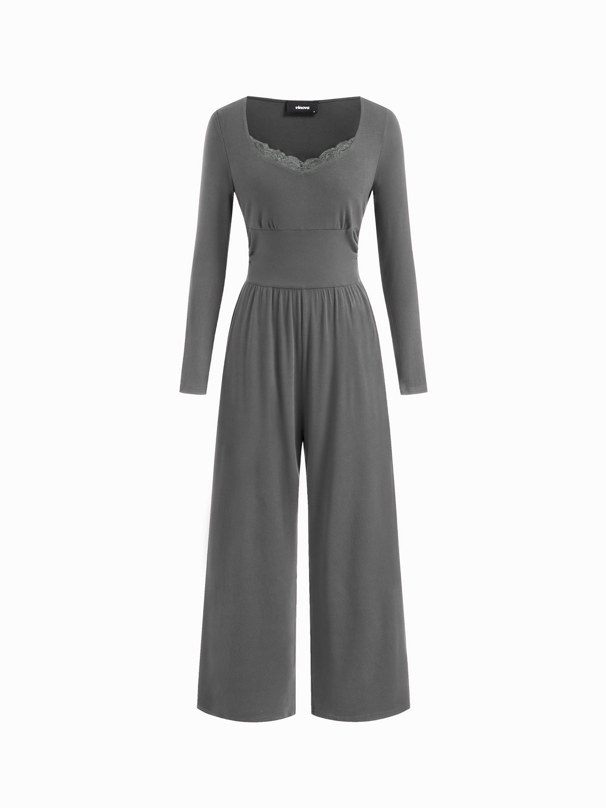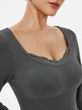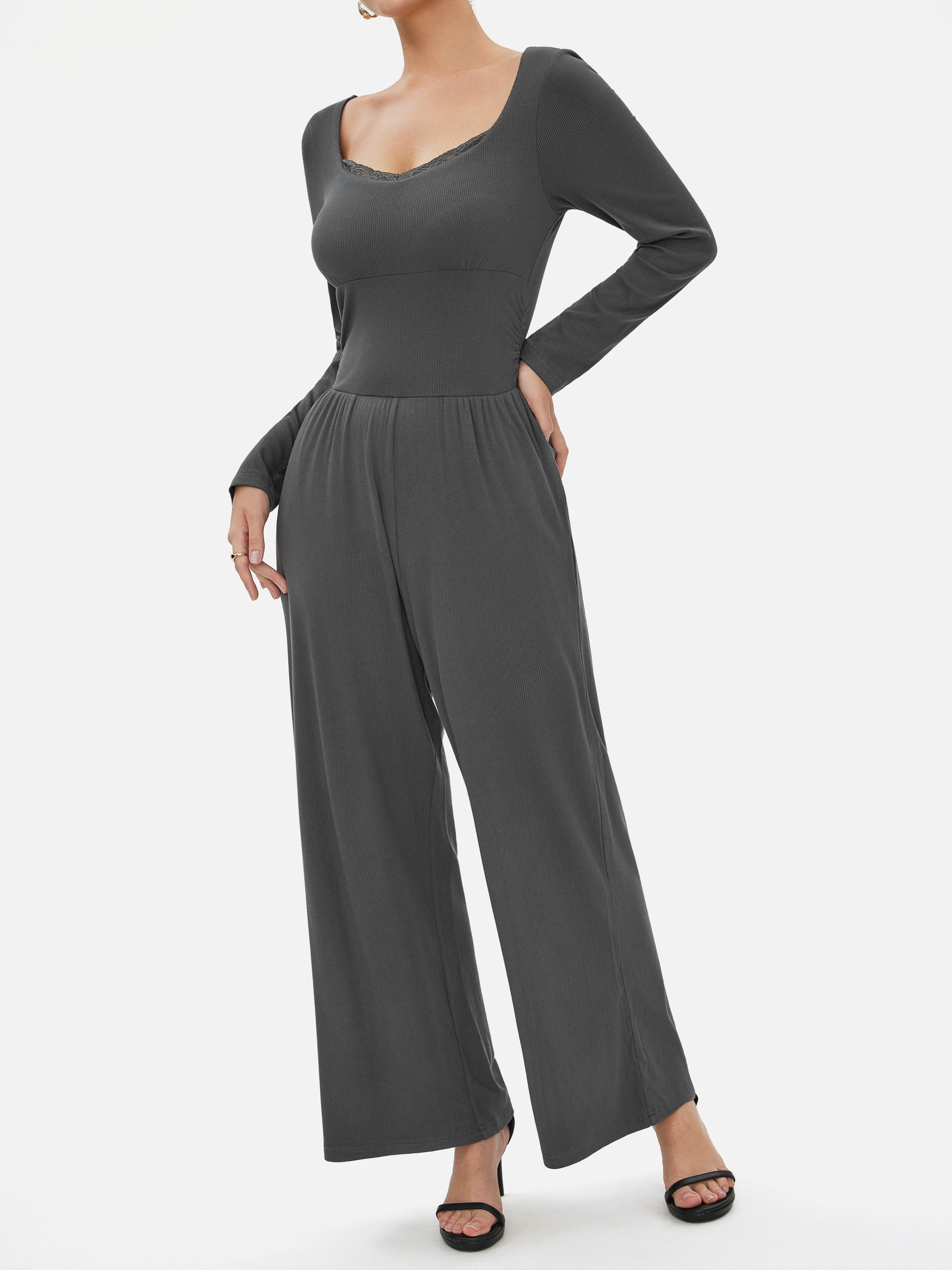 Long Sleeve Square Neck High Stretch Jumpsuits with Lace Trim