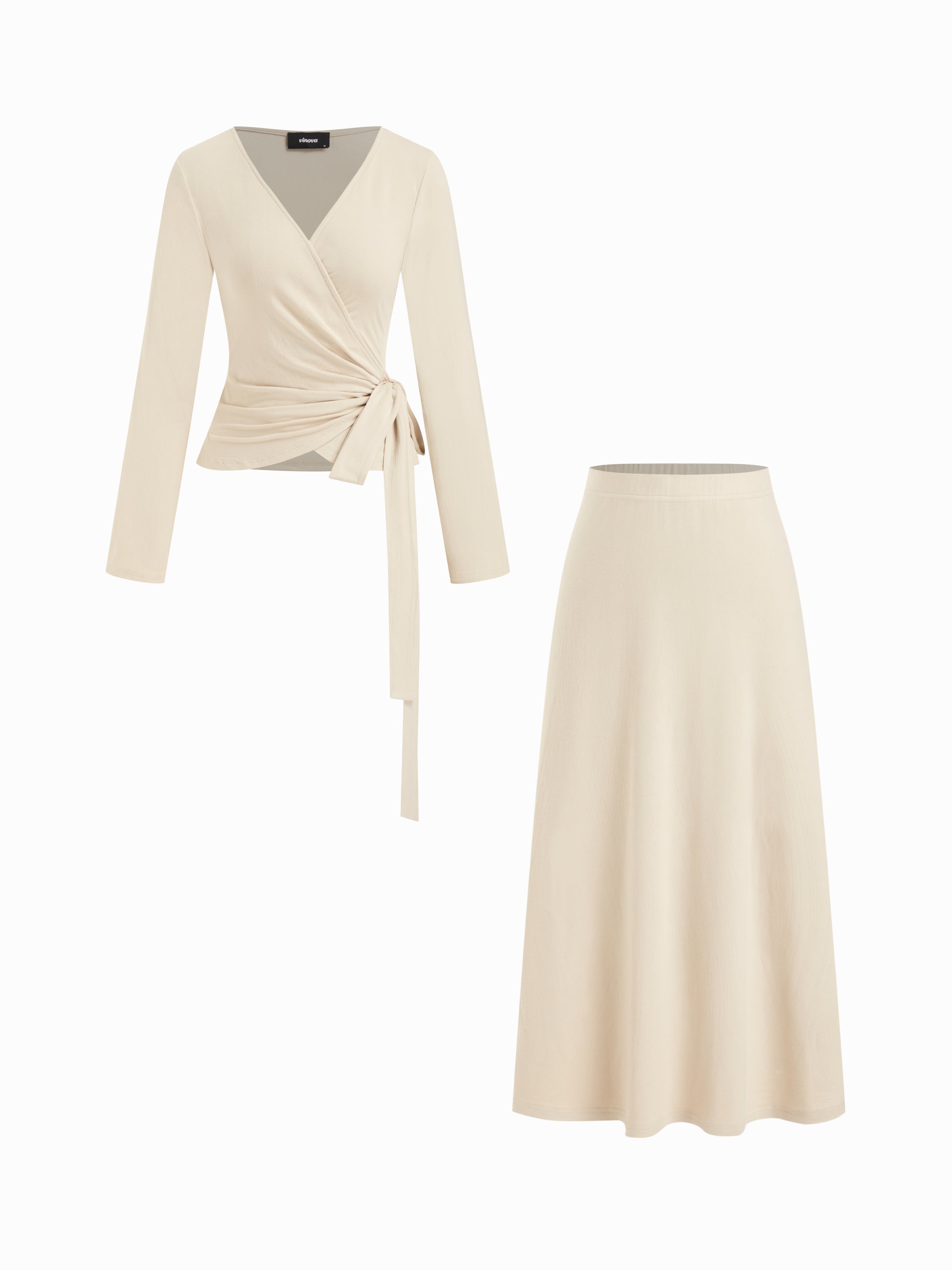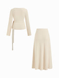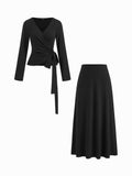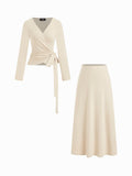 V-Neck Tie Waist Top & Full Elastic Waist Skirt Set