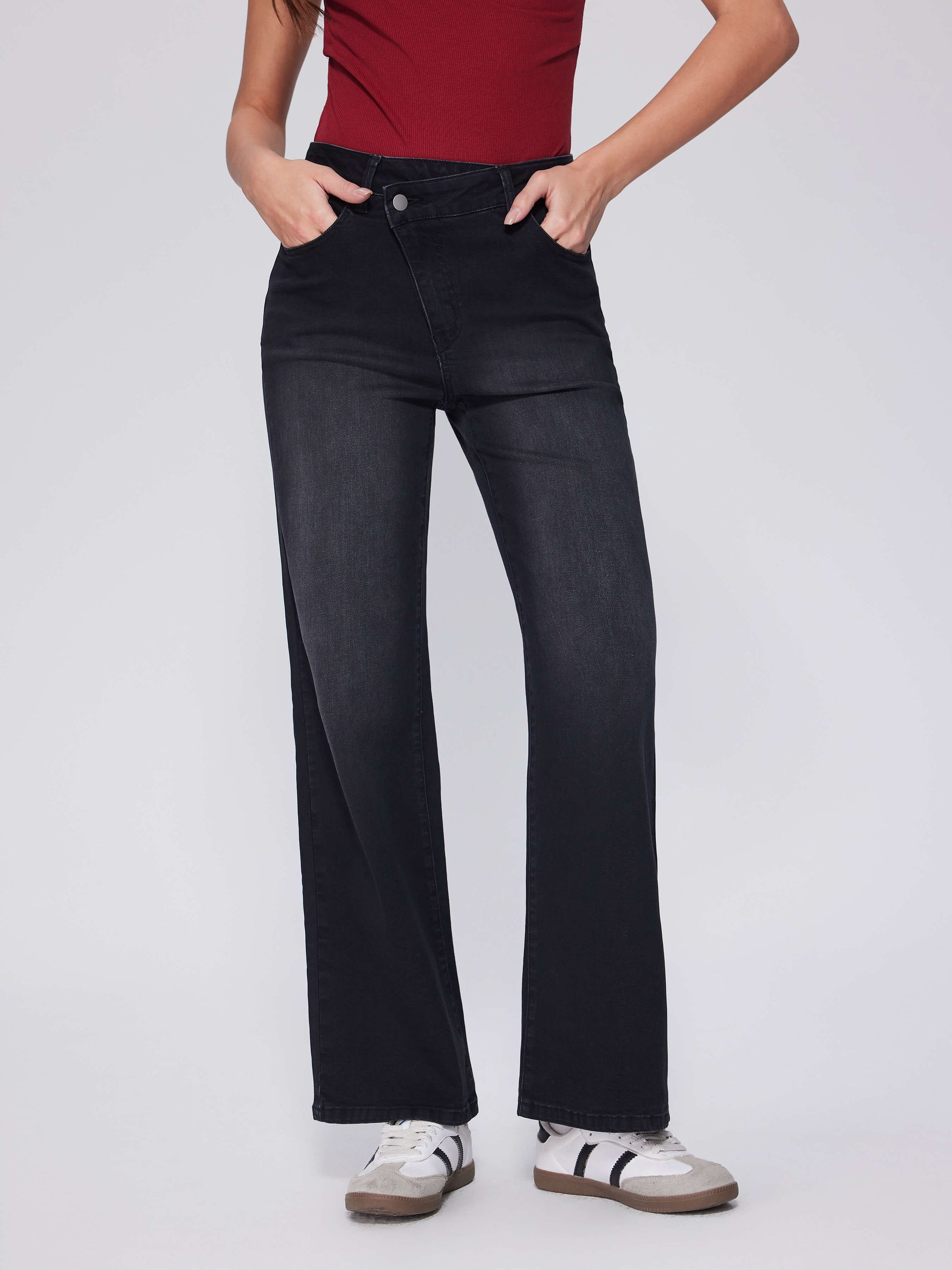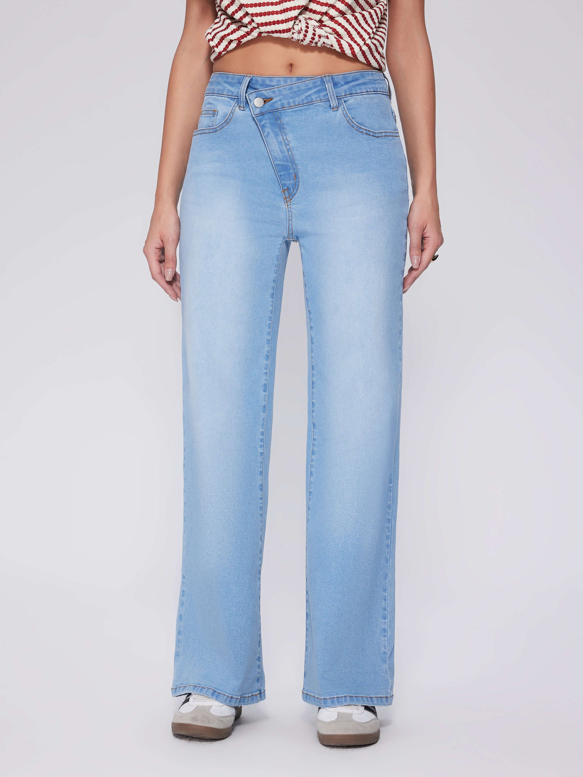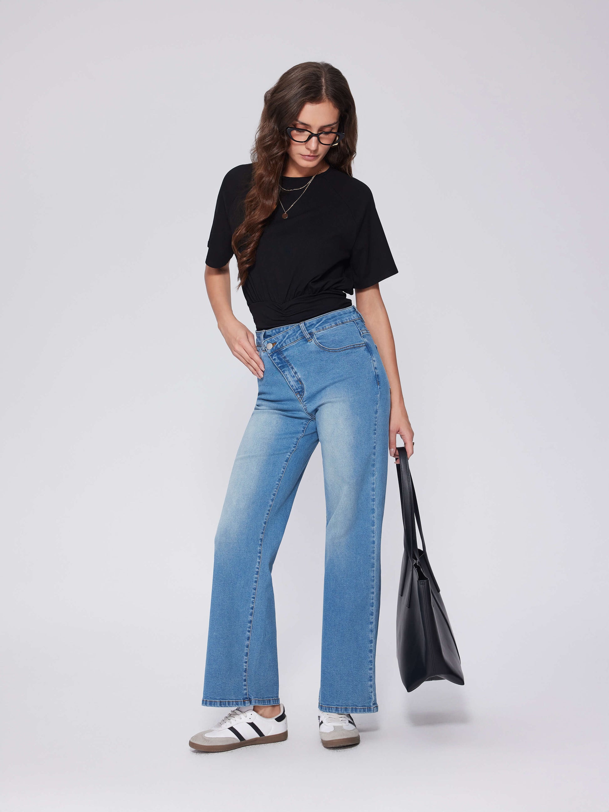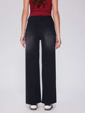 Stretchy Cross Fly High Waisted Wide Leg Baggy Jeans with Pockets