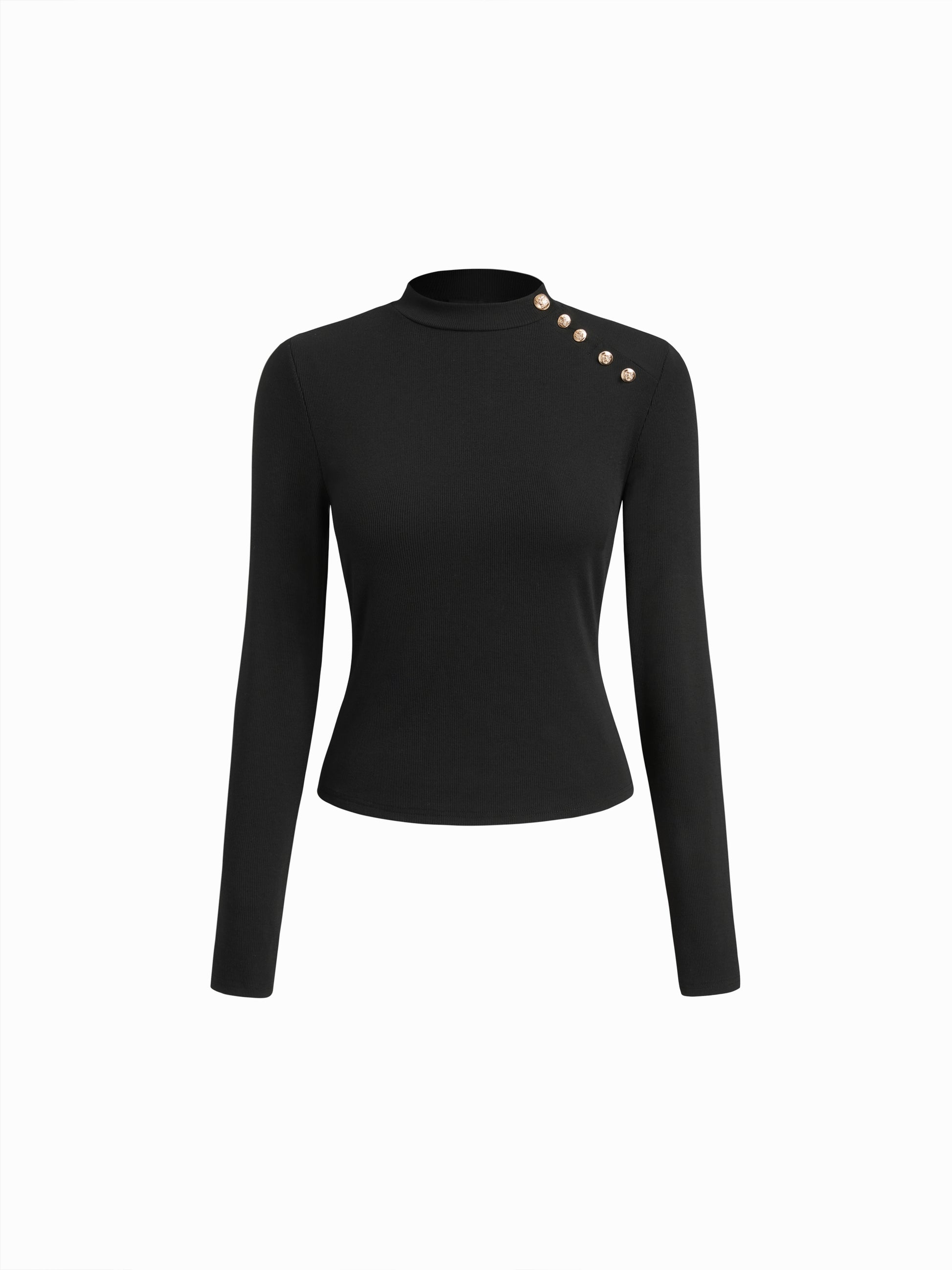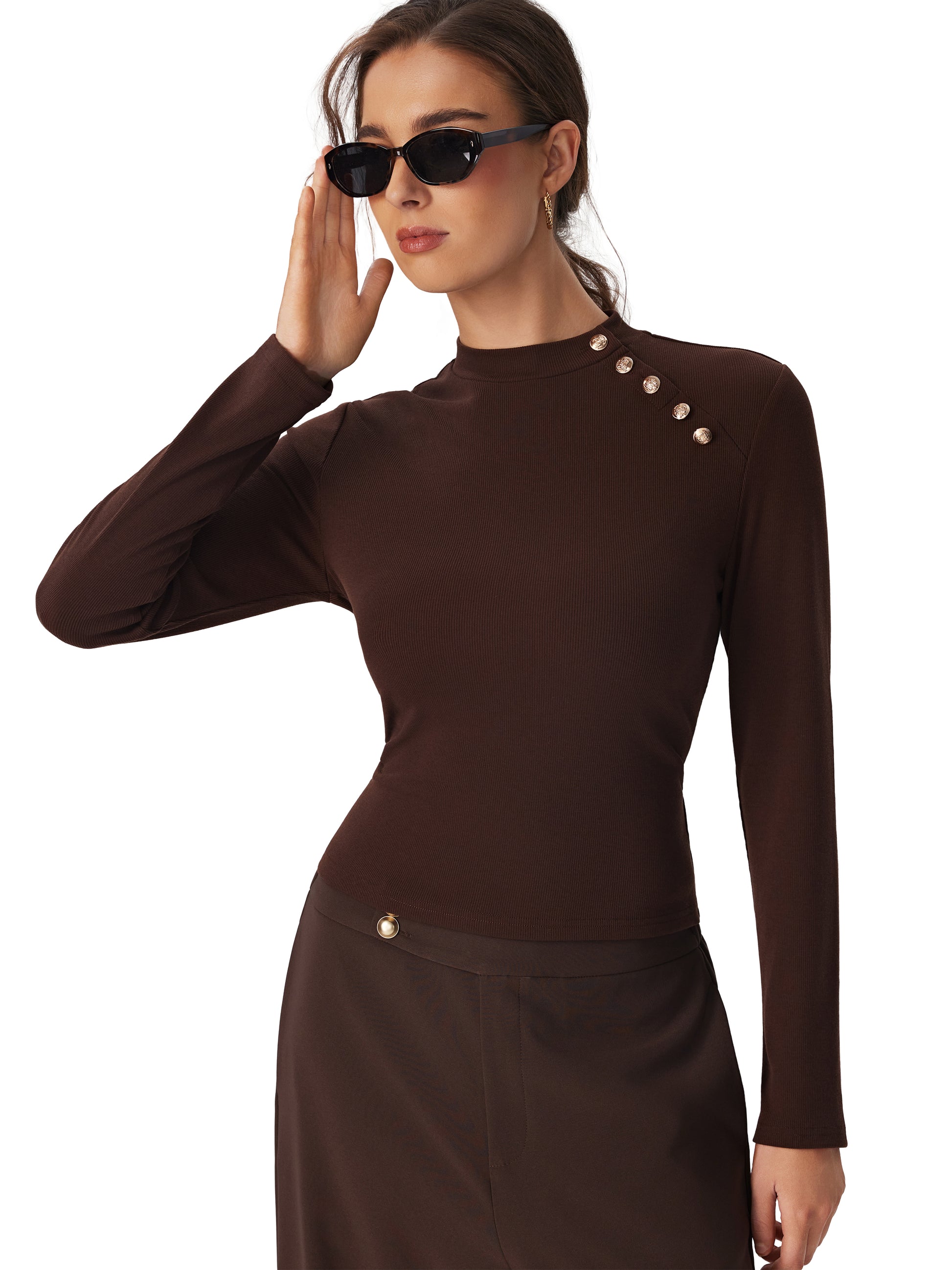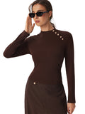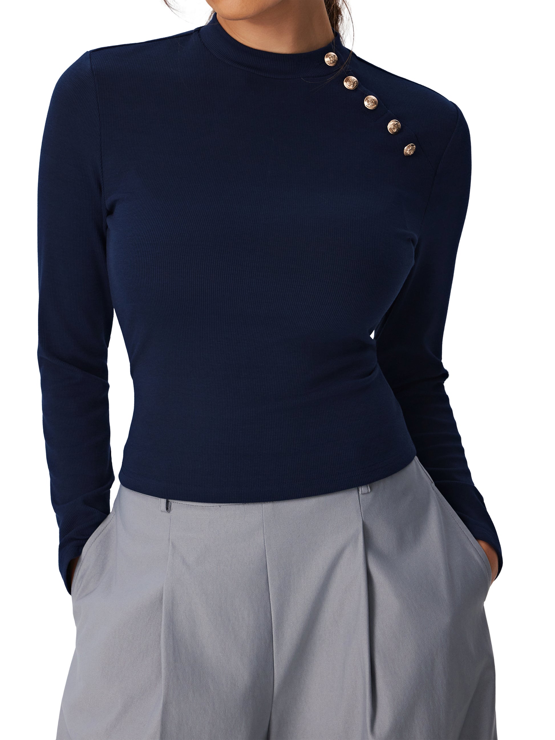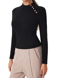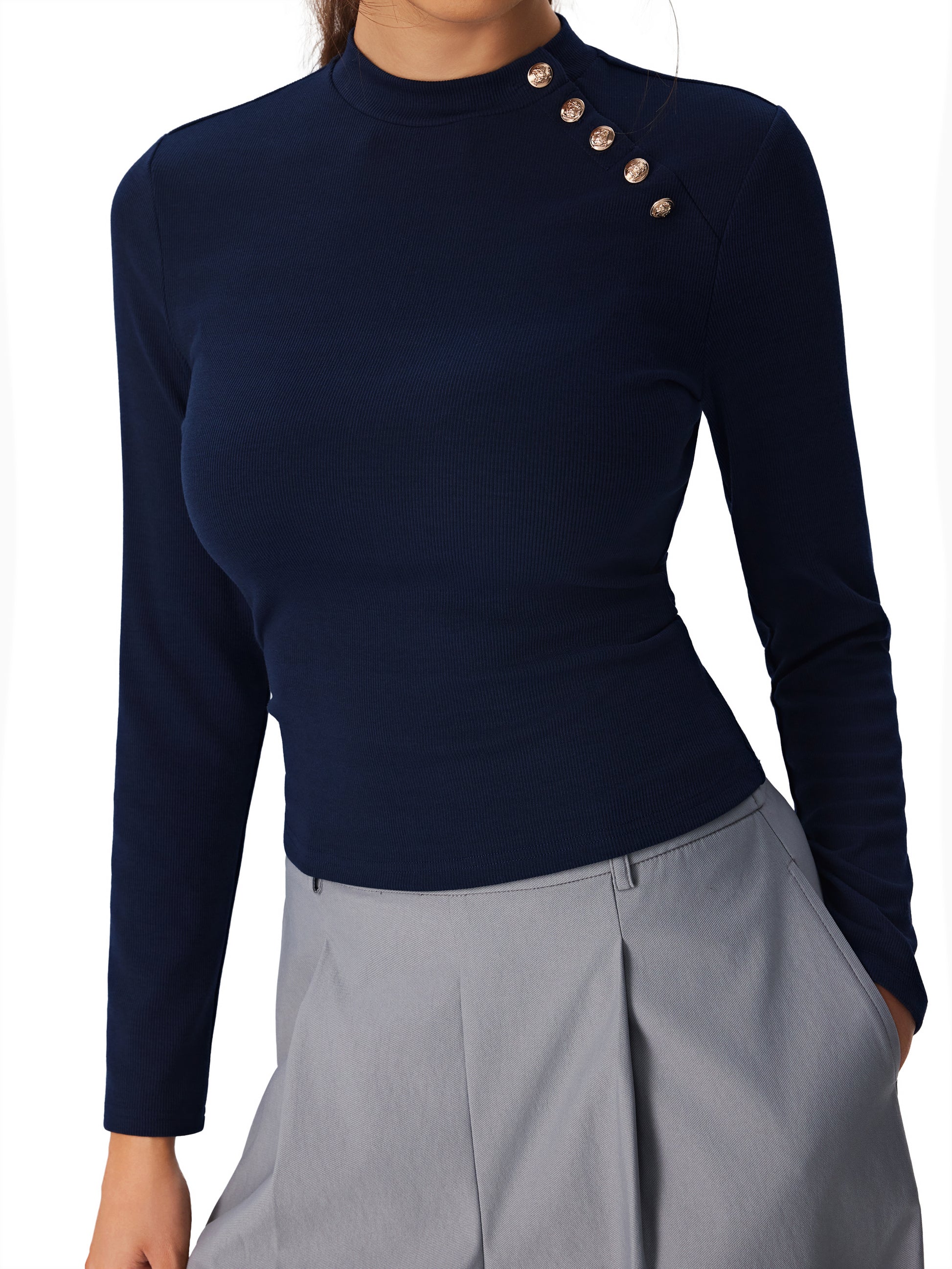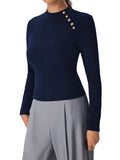 Womens Ribbed Knit Top Long Sleeve Mock Neck Shirt Button Detail Blouse